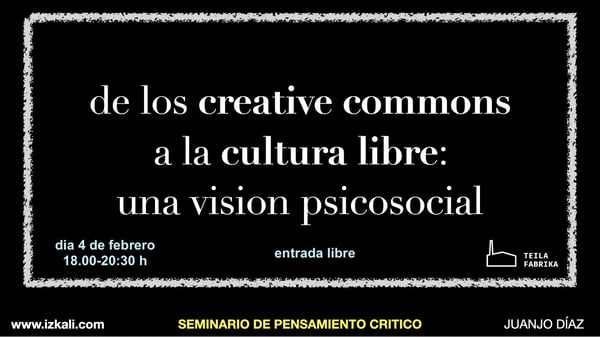 El día 4 de febrero vamos a realizar una sesión presencial del Seminario de Pensamiento Crítico dedicada al tema de la Cultura Libre. Desde Izkali social damos soporte técnico, con la perspectiva de la gestalt social, a los proyectos de la asociación Campo Creativo Cero, entre ellos el Festival de cine social y cultura libre (cineCCdonostia) que este año ha realizado su octava edición. Una de las actividades del festival es difundir la filosofía, los valores y la praxis de la cultura...