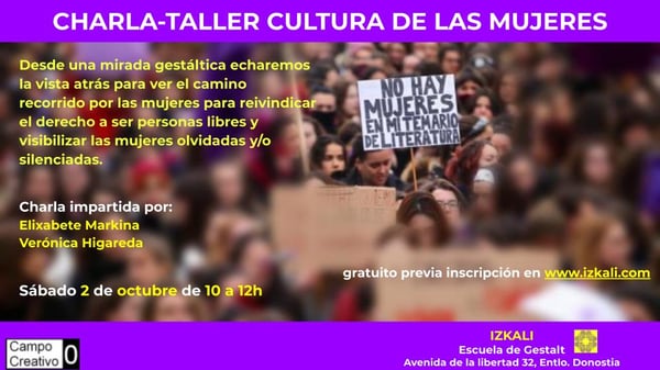 Este año el Taller Cultura de las Mujeres (TCM) incluye un ciclo de tres charlas-coloquio con personas expertas en el trabajo con grupos de mujeres, grupos de igualdad de género, investigaciones, elaboración de materiales sociopedagógicos, etc. Cada sesión tendá un formato de conversación en que la invitada contará su experiencia referida más o menso a la teoria y metodologia, y luego conversaremos distendidamente, haciendo preguntas,intercambiando opiniones, aportando otas...